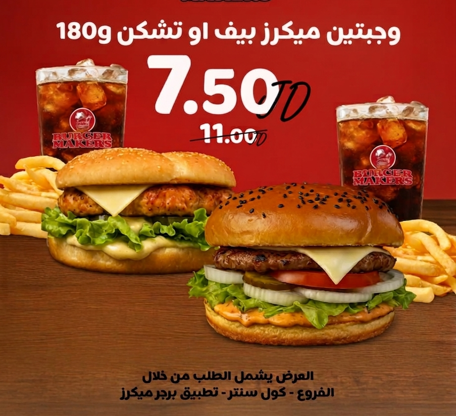 وجبتين ميكرز 180غ من اختيارك بيف او تشكن & و2 ساندويش نشمي 80غ من اختيارك بيف او تشكن