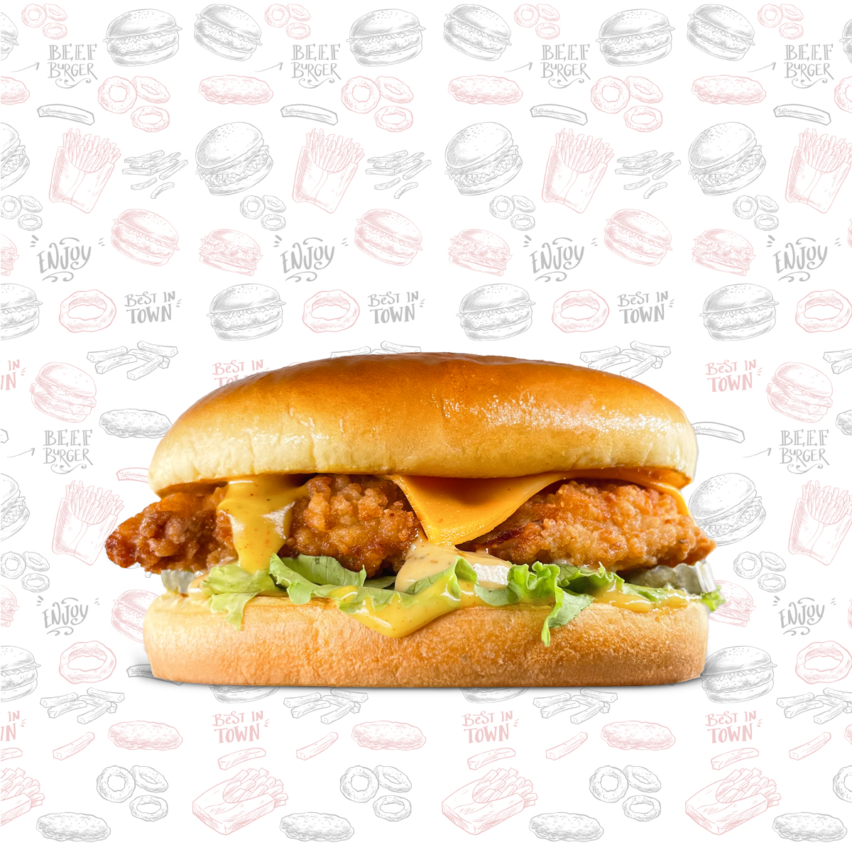 Fried Crispy Chicken (150 gm) ,Lettuce, Tomato, Cheddar Cheese, Chicken Makers Sauce