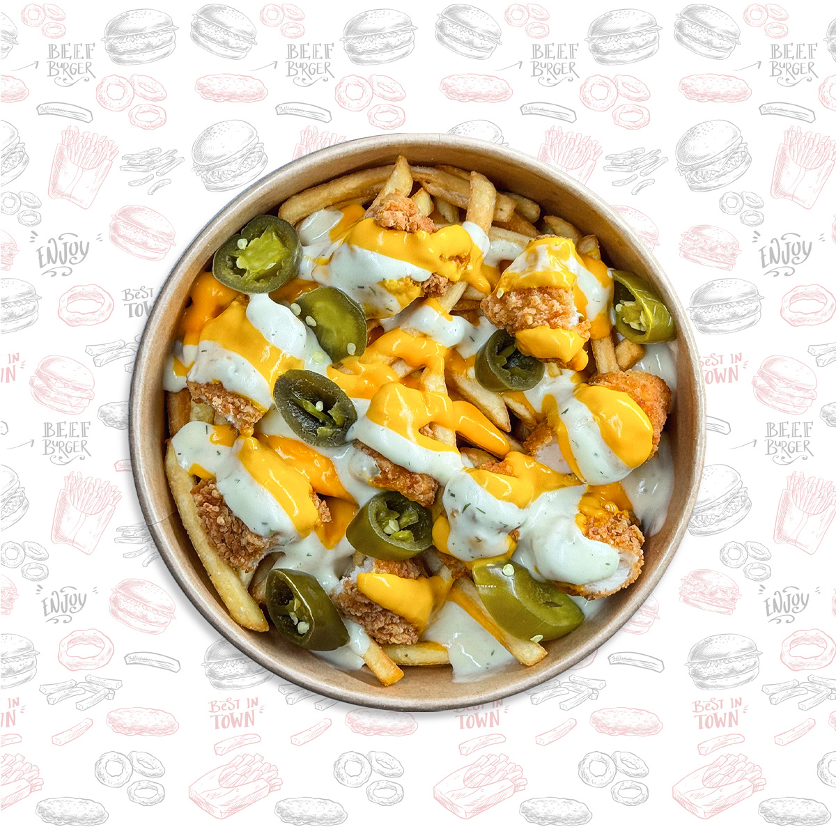 Fries, pieces of Crispy Chicken, Ranch, Cheddar Cheese and Jalapeno.