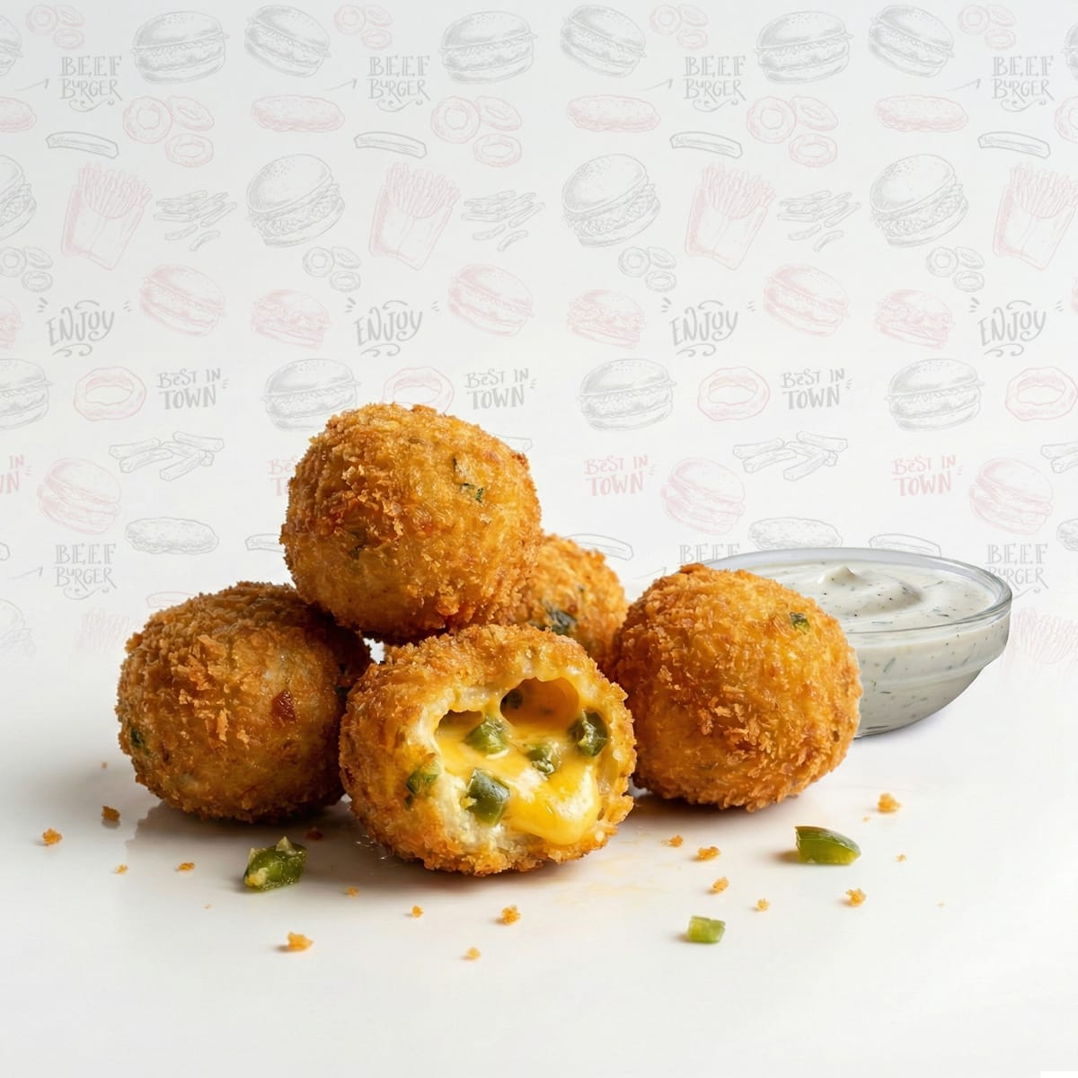 5 Pieces of crunchy cheese and jalapeño balls stuffed with jalapeño-flavored cheddar cheese served with a sauce cup of your choice